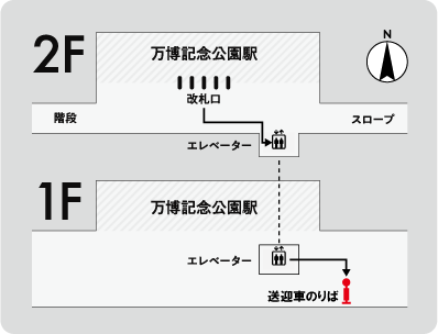 大阪モノレール「万博記念公園駅」1階ロータリーより、無料の送迎車を運行いたしますのでご利用ください。