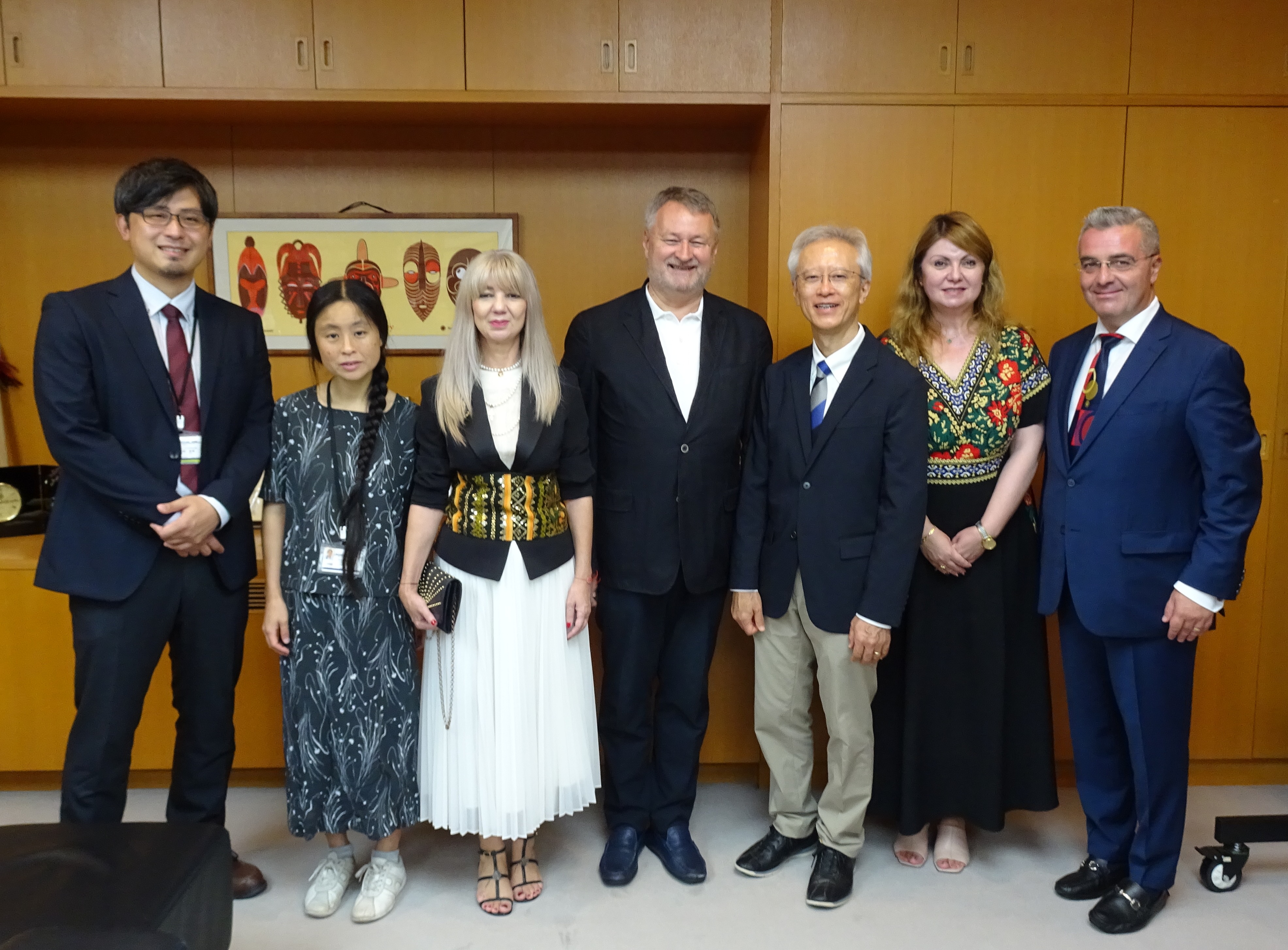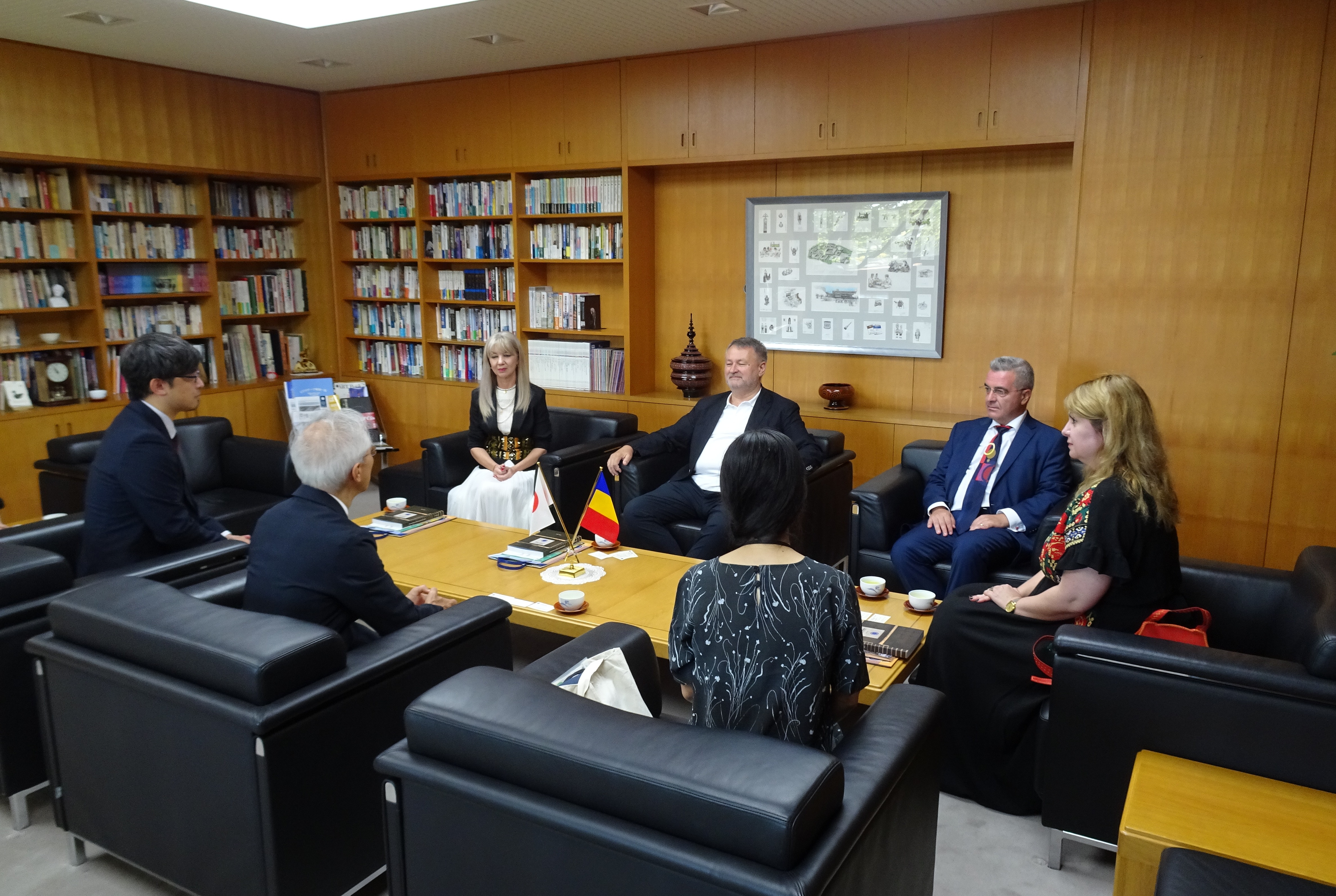 写真左から)浅田直規助教授、河西瑛里子助教授、ルーマニア文化省代表 ミハユ・カルメン様、大阪・関西万博ルーマニア館 総代表 ナギー・フェルディナンド様、福岡副館長、兵庫県立大学 タマシ・カルメン教授、ルーマニア国立銀行知事特別補佐 ニツェスク・ダン様