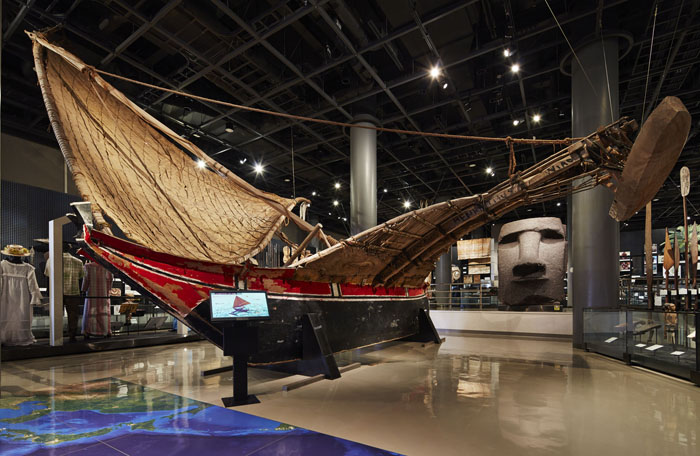 国立民族学博物館は本年2月28日から臨時休館中である。一般の見学が停止されていた3月の中旬、アメリカ展示場で小規模な改修作業が完了した。これによりメキシコの「アレブリヘ」コーナーに新しい資料が6月18日より再開した本館の常設展示。入り口すぐのオセアニア展示場で最初に目に入る展示コーナーに遠洋航海カヌーのチェチェメニ号がある。海を越えた人類の移住を考える上で、舟は人類学的にも重要な物質文化だ。
