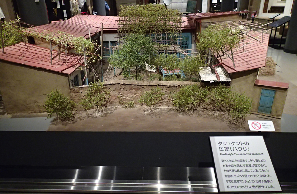 みんぱくの中央・北アジア展示場には、1983年に製作された、ウズベク人の民家の10分の1模型が展示されている。それは当時の旧ソビエト連邦ウズベク共和国の首都、タシュケントに実際に存在した民家がモデルになっており、建物の造りや部屋の間取りだけでなく、ブドウ棚の造作や、中庭の樹木の葉っぱ一枚一枚までこだわって精巧に作られている。