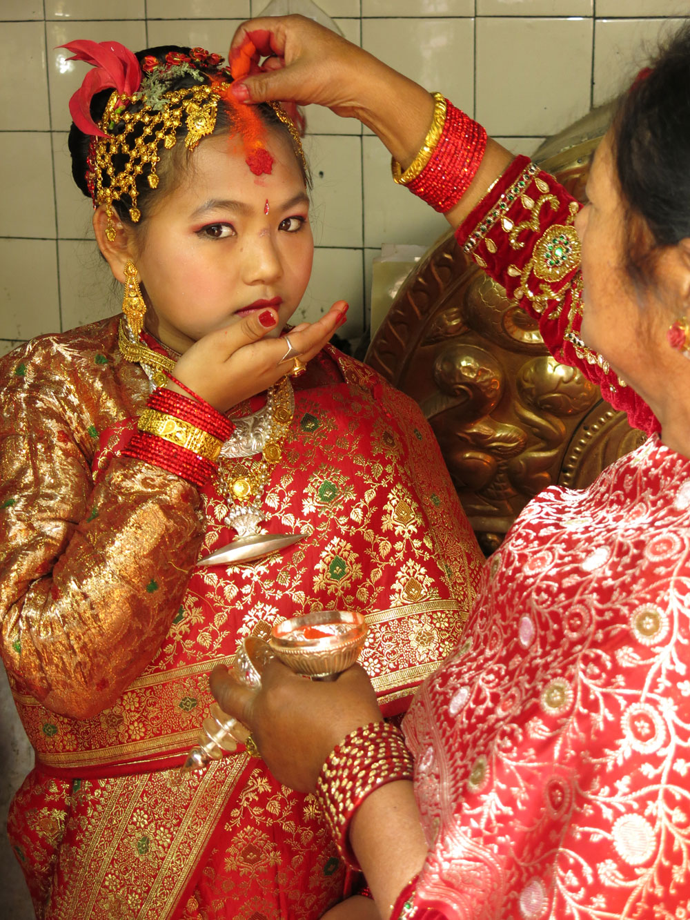 初潮儀礼で既婚女性がつけるシンドゥールを受けとる女の子 2015年12月