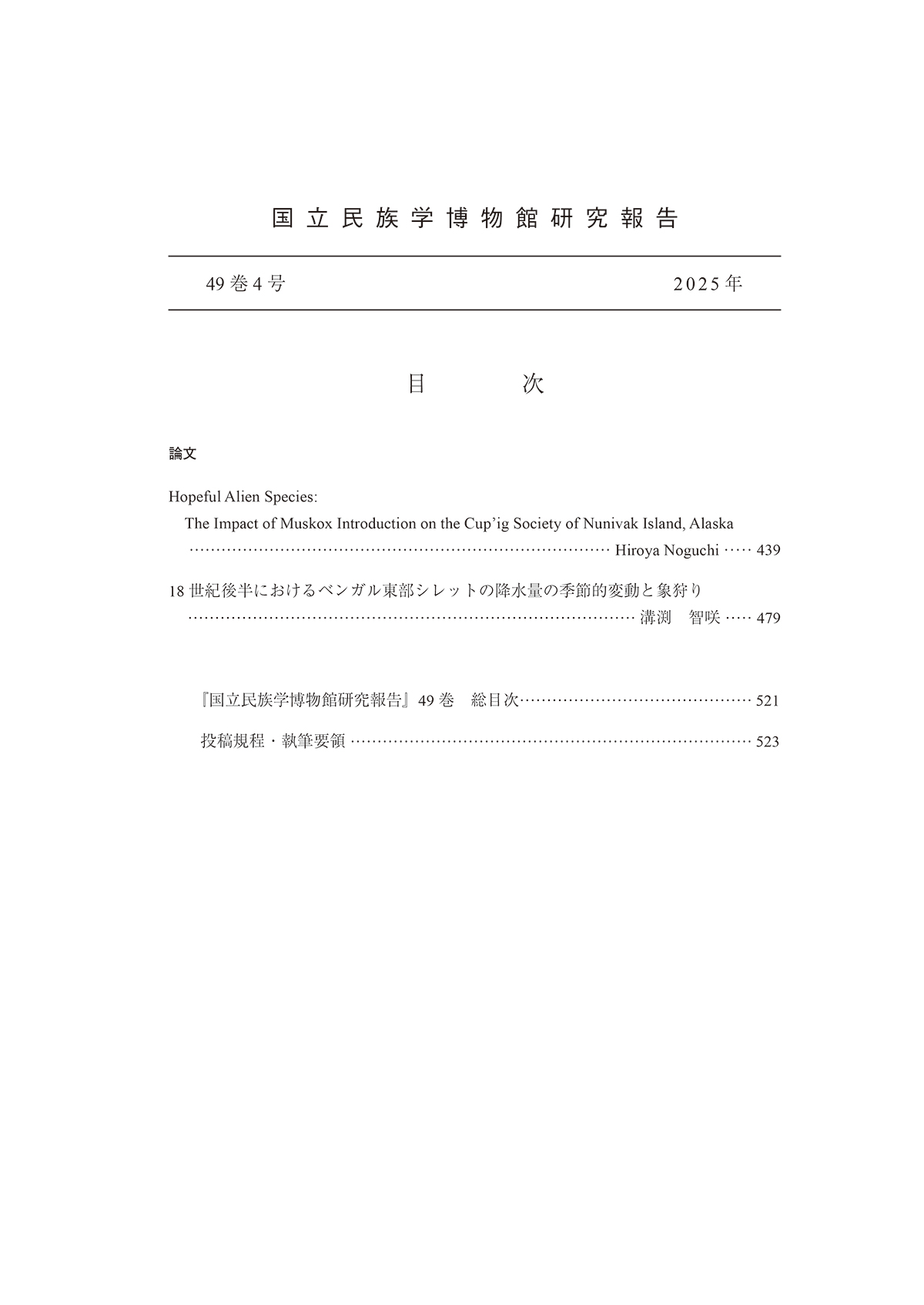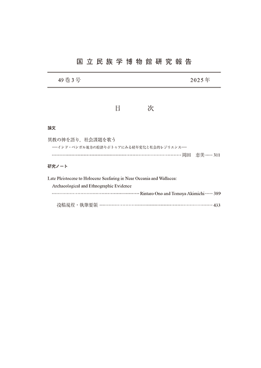 『国立民族学博物館研究報告』は、民族学(文化人類学)の発展に寄与するために、国立民族学博物館が刊行する研究誌です。この目的に即して、民族学、人類学および関連諸科学に関する論文、書評論文、資料、研究ノートを掲載しています。年4回出版。