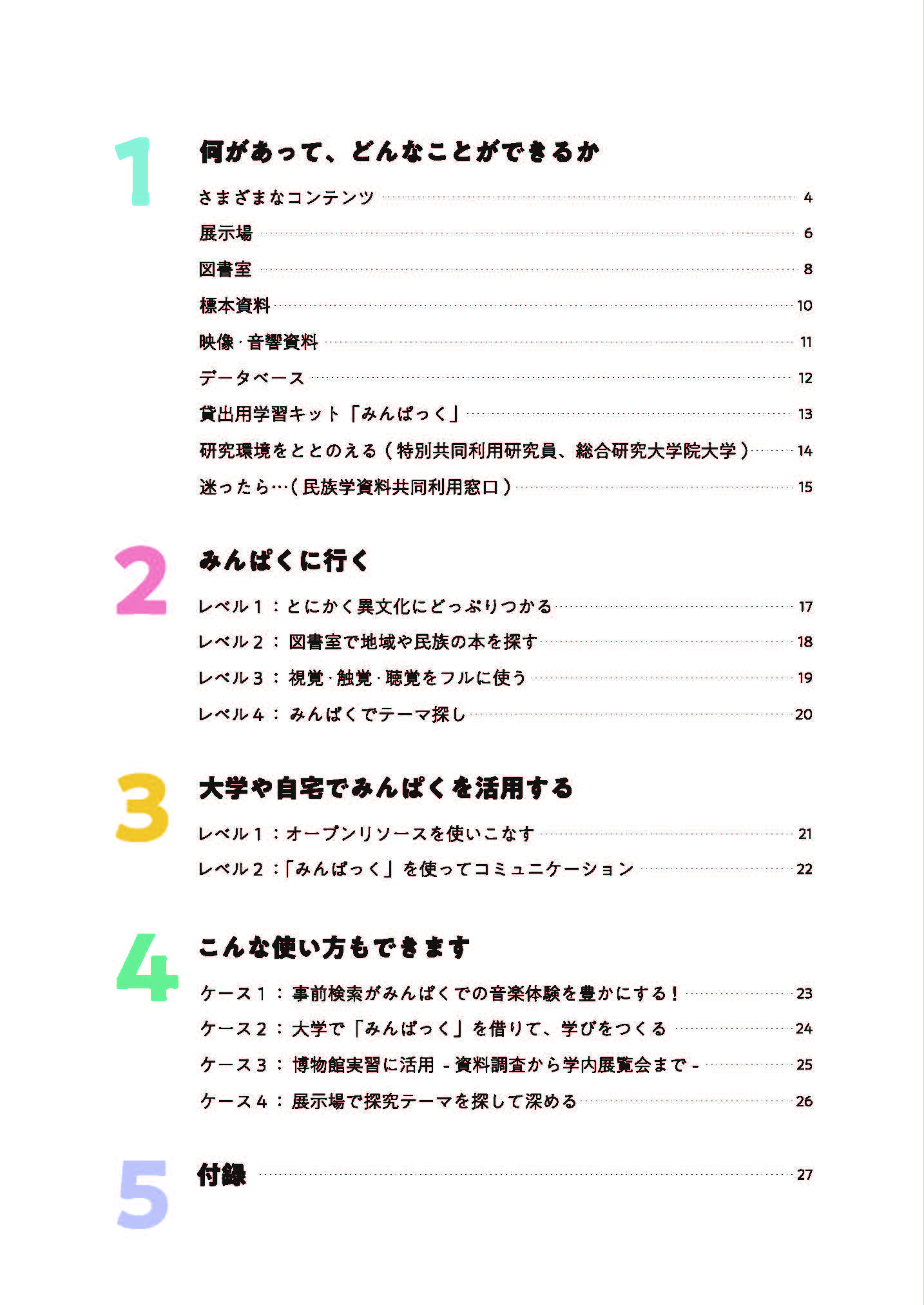 このブックレットは、みんぱくのコンテンツやその活用術を紹介し、それぞれの目的や関心に合わせて使ってもらうための「トリセツ」です。